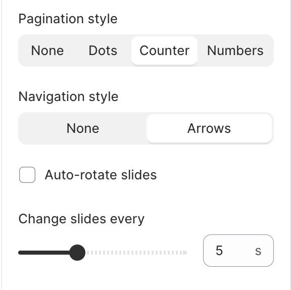 Enable **Auto-rotate slides** to run the slideshow automatically. The duration time to change slides is between 3-9 seconds. If you don't want to use rotation, you can disable it and use pagination or navigation.