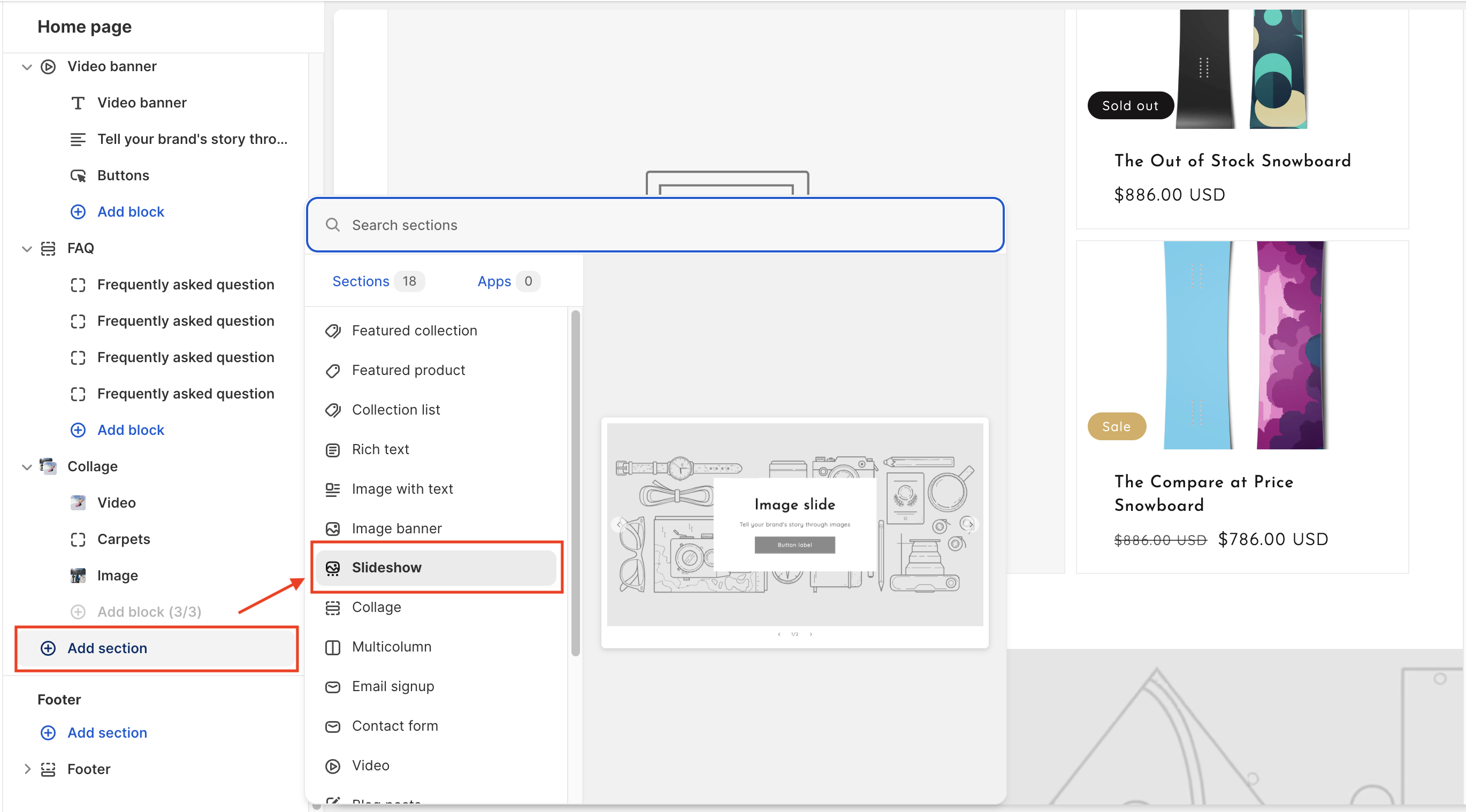 * In the theme editor, click **Add section.**