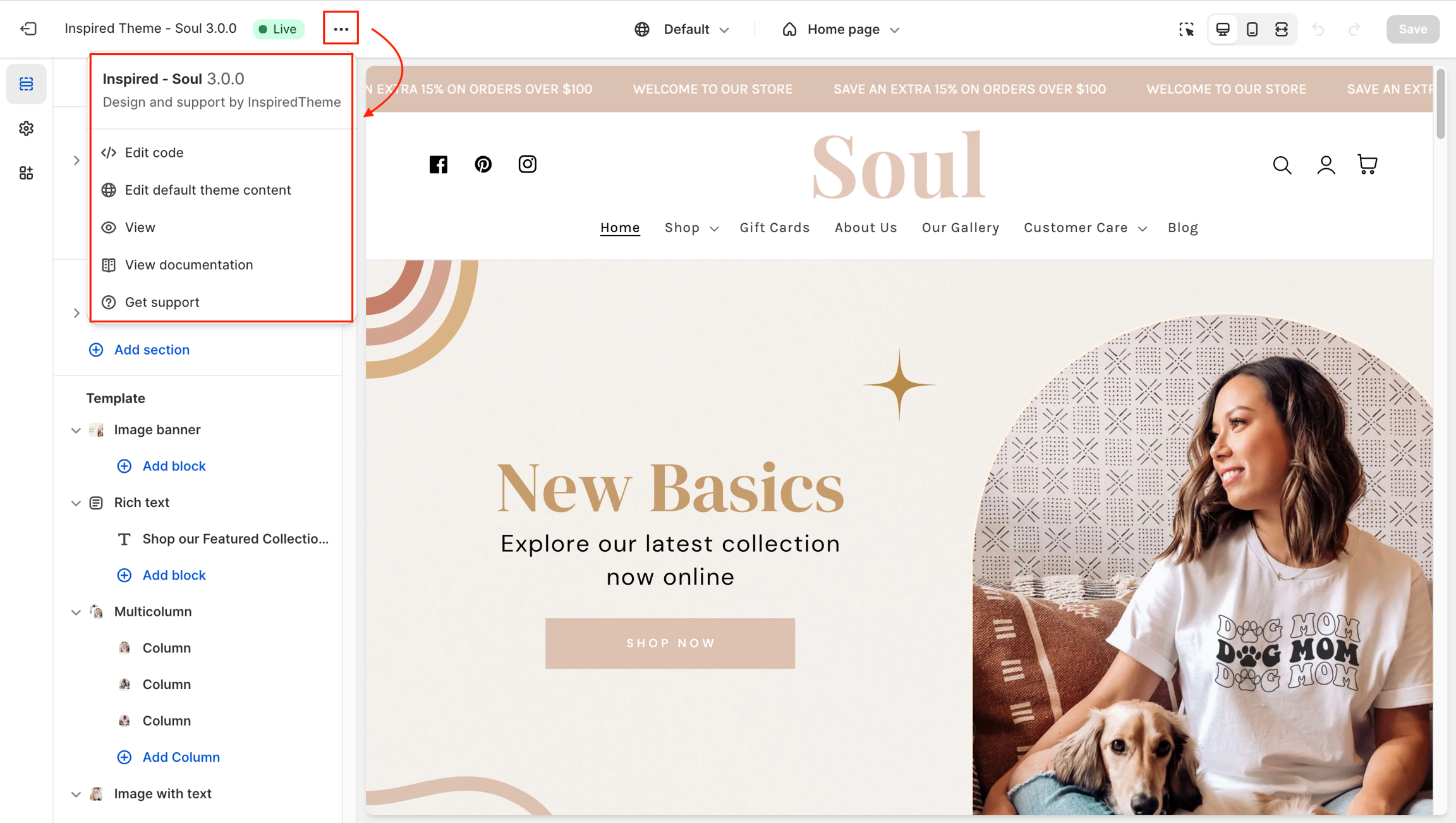 To check your current version of InspiredTheme, click on the ellipses (three dots) icon at the top of the Theme editor to view theme actions including the version number: