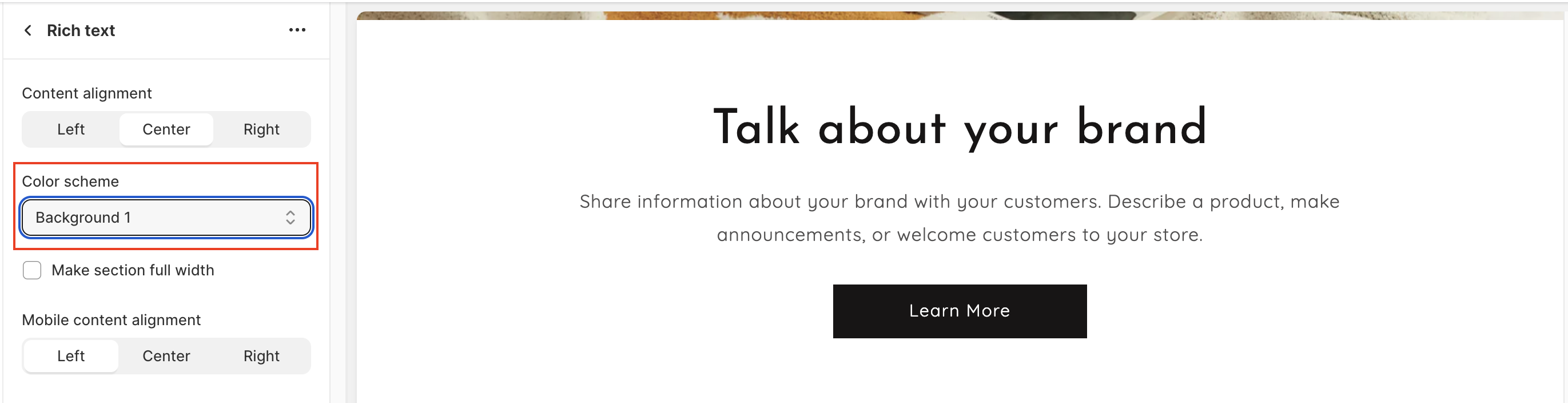 * Click the **Rick text** section to open the **Color scheme** setting.