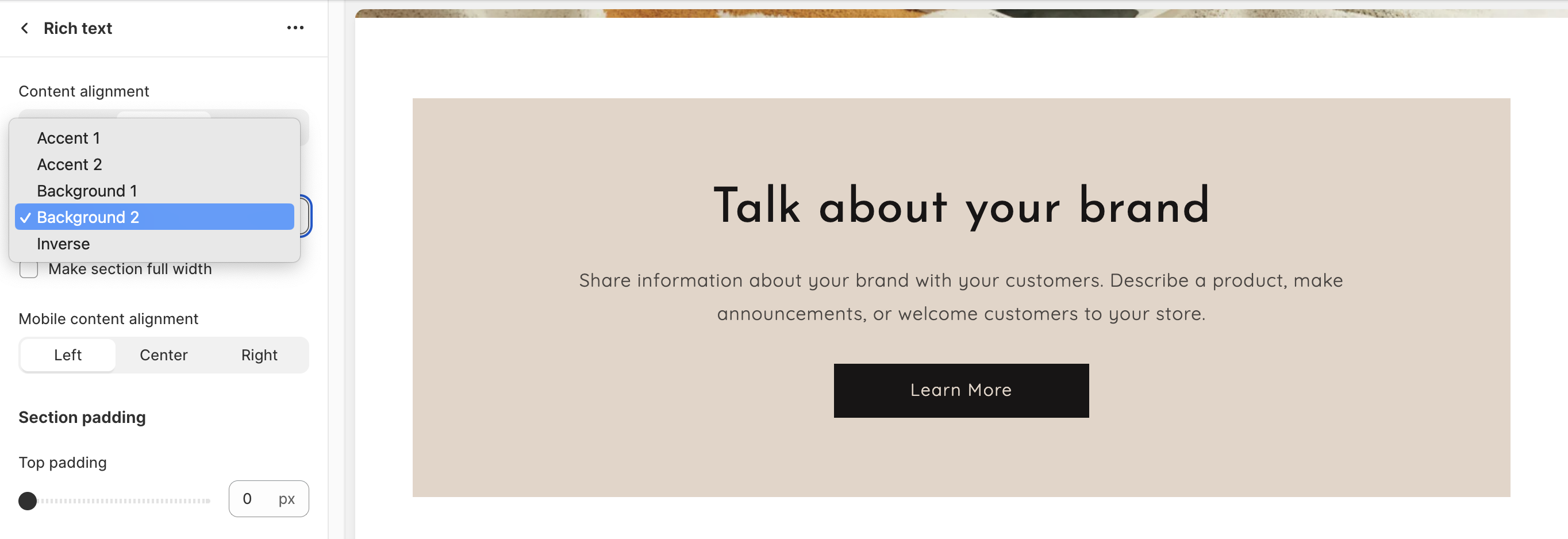 > ***Background 1:** Your store’s background color. This is the most dominant color present in your store.*