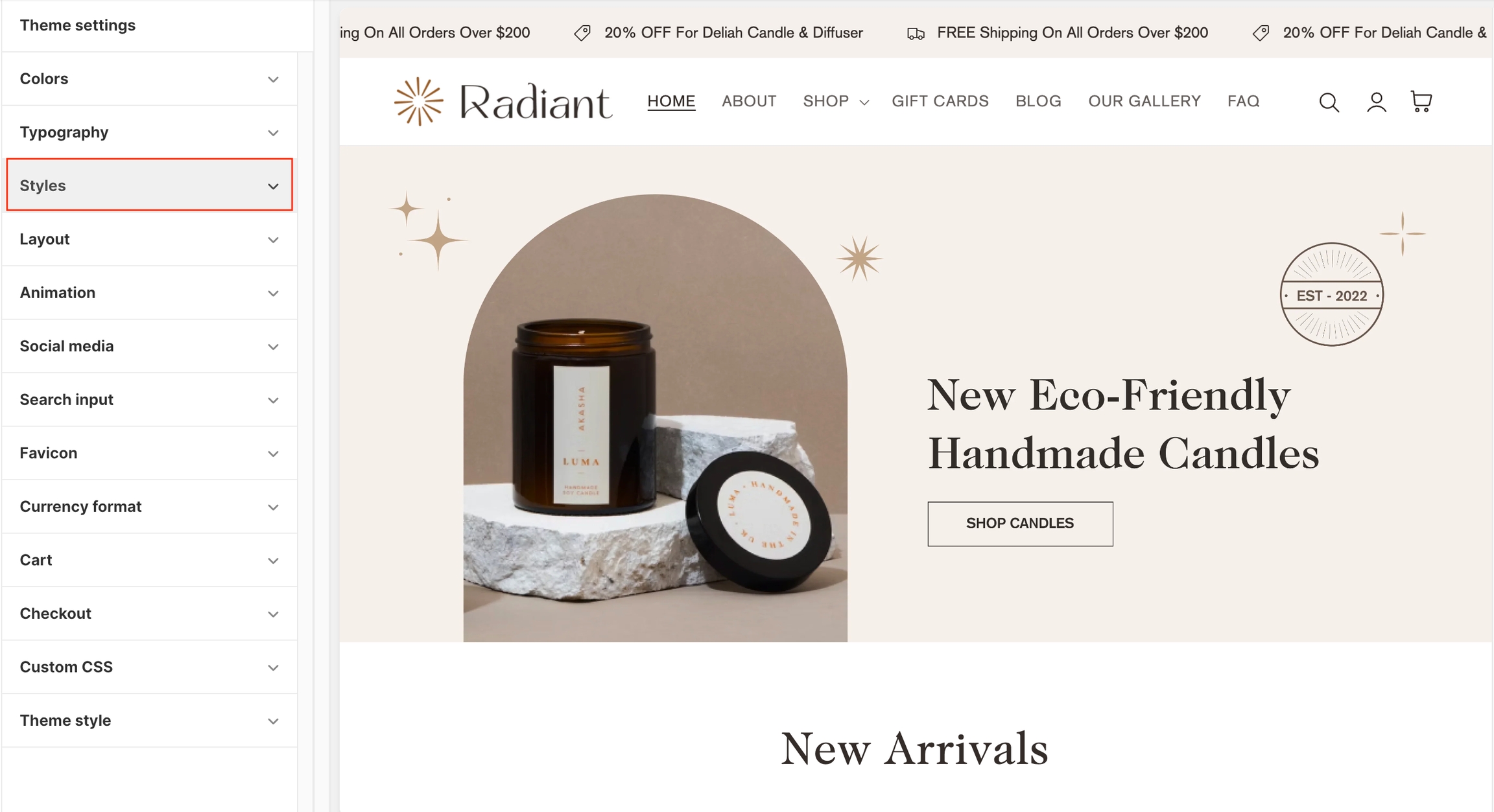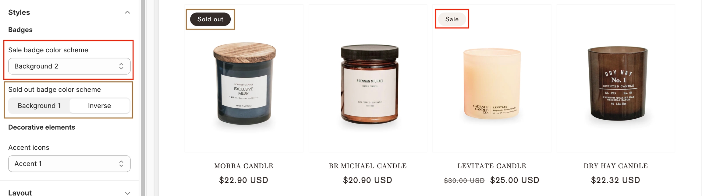 The "Styles" settings enable you to change the colors of the Sale and Sold Out badges.